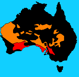 MALLEE UND MULGAMallee-scrub (rot) und der Mulga-scrub (orange) sind die zwei in den semiariden Gebieten Australiens vorherrschenden Vegetationsformen. Hier fallen nur etwa 250 mm Niederschlag pro Jahr, alle Pflanzen in dieser Region müssen damit auskommen. Diese riesigen Bereiche sind für Australien charakteristisch, sie bilden einen Gürtel um die zentralen Wüstengebiete und gehen am Rand fließsend in Savannenzonen über.