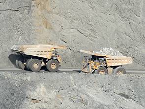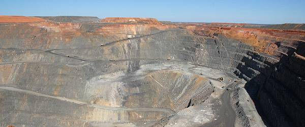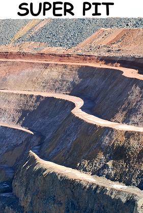 Magisch wird man vom Zaun angezogen, der den Abgrund in Richtung Tagebau begrenzt. Hier blickt man hinunter auf autobahnbreite Stufen und winzig kleine Fahrzeuge, die zu Giganten wachsen, wenn sie näher herankommen. Von oben wirken sie wie Spielzeug, was die Größe des Tagebaus anschaulich verdeutlicht. Ständig fahren sie voll bergauf und leer bergab, das Beladen und der Transport der Ladung zum Entladen und die Rückkehr zum Bagger dauert im Durchschnitt 45 Minuten. Die Straßen nach oben sind ca. 30 Meter breit, mit einer maximalen Neigung von 10%. Dies sind die optimalen Bedingungen zur Schonung der Reifen, von denen einer immerhin AU$ 26.000 kostet. In der Super Pit Mine wird alles über GPS gesteuert, der gesamte Ablauf in der Mine sowie der Einsatz und die Überwachung der Fahrzeuge.