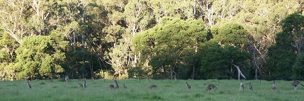 Vor allem in den frühen Morgenstunden und in der Dämmerung grasen große Herden im Tal und lassen sich von überall her gut beobachten. Man kommt sehr nah heran, nur die Weidezäune stoppen die Annäherung. Das wissen die Kängurus auch und bleiben meist sitzen. Sogar im Ort hüpfte in der Dämmerung eine Mutter mit Kind ohne Scheu an uns vorbei. Auch auf dem Campingplatz sitzen dutzende von Tieren auf dem Rasen und lassen sich beim Fressen nicht stören.