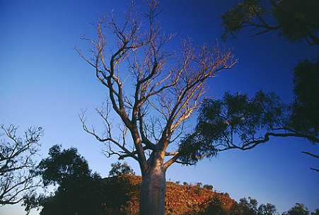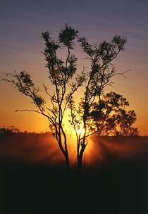 Auch der 4 km lange Weg durch die ebenso lange Keep River Gorge, 23 km vom Eingang entfernt auf der rechten Seite, ist ein Erlebnis. Im Laufe der Jahrtausende entstand diese Schlucht mit hohen, roten Felswänden. Auf dem Talboden wandert man vorbei an mächtigen Baobab-Bäumen. Das Bild unten entstand am Eingang der Schlucht kurz vor Sonnenuntergang, wenn das Licht am schönsten ist. Wenn ein Auto vorbeifährt, dann wirbelt es eine Staubwolke auf, welche die untergehende Sonne noch schöner macht, wie auf dem Foto links zu sehen.
