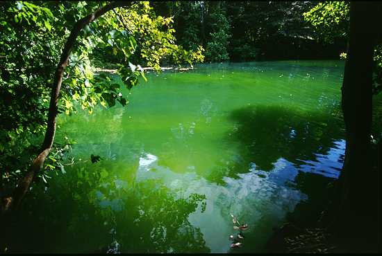 Rund um das Bassin gibt es Einstiege ins Wasser, meist etwas versteckt im Wald. Ein Bad ist hier sehr erfrischend, bleibt man länger im Wasser kann es schon ziemlich kalt werden. Der hintere Teil des Pools ist ziemlich veralgt, hier ist das Wasser grün. Beim Schwimmen streifen einen manchmal die kratzigen Enden der Algen an den Beinen entlang, eine erschreckende Überraschung. Keine Angst, die dicken Fische halten Abstand von badenden Menschen. Wenn man Glück hat und nicht gerade kreischende Kinder im Wasser planschen, kann man auch ab und zu eine Schildkröte beobachten.