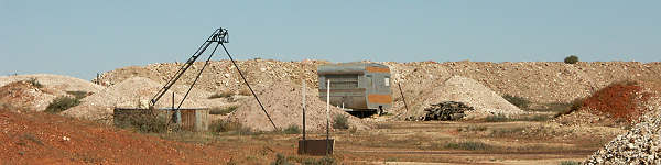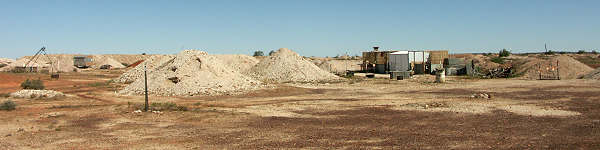 Hinweißchilder und Wegweiser führen in die Opalfelder. Ab und zu sieht man eine Hütte und einige schwere Arbeitsgeräte herumstehen, Menschen sieht man kaum. Die meisten bewegen sich hier unter der Erde. Straßen bzw. Fahrspuren gibt es hier auch, die sind aber höchst unübersichtlich. Wer will, der kann in den Abraumhalden nach kleinen Opalsplittern suchen, aber das ist wohl wie die sprichwörtliche Suche nach der Nadel im Heuhaufen.