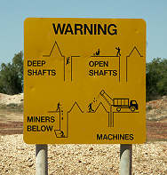 Wir fuhren mit dem Camper ein wenig herum, gaben aber schnell wieder auf. Man kann nie sicher sein, das alle Löcher auch abgesperrt sind und hat sich hier schnell verfahren. Auch das Herumlaufen ist gefährlich, schon mancher ist in einem "blind hole" verschwunden und hat sich mindestens ein paar Knochen gebrochen. Die stillgelegten Luftschächte und Zugänge unergiebiger Minen warten schon auf den nächsten Pechvogel.