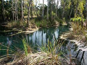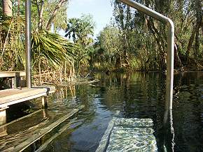 Beim ersten Besuch im Jahr 2001 haben wir sie leider verpasst, obwohl sie eigentlich ganz einfach zu erreichen sind. Die wenigsten Besucher wissen aber überhaupt von ihrer Existenz und so liegen die Quellen der Bitter Springs, auch Korran genannt, abseits der Touristenhorden. Im Ort Mataranka, gleich am Eingang von Darwin aus kommend, führt eine Stichstrasse in Richtung Territory Manor Motel. Hier kann man ebenfalls übernachten und campen, auffallend sind die vielen Pfauen auf der Anlage. Fährt man am Motel vorbei so gelangt man nach einer Weile zu den Bitter Springs.