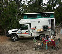 Wenn man Natur pur erleben will, dann kommt man mit einem normalen Camper in Australien nicht sehr weit, vor allem im Top-End und im Outback. Viel zu viele Straßen sind ungepflastert und von den Witterungsbedingungen übel zugerichtet. Also muss ein Allradfahrzeug her. Wir haben uns erstmals 2001 für den damals nagelneuen Adventure Camper der Firma Apollo entschieden, 2004 und 2006 hatten wir die neu gestaltete Versionen und auch 2007 ist wieder einer reserviert.