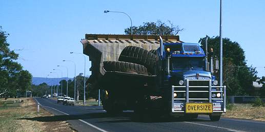 Wenn ein Truck breiter beladen ist als 2,5 Meter oder länger, als für den jeweiligen Lastwagen-Typ zugelassen, so genügt ein oranges Blinklicht sowie ein Schild "OVERSIZE" vorn und hinten, schon hat man einen Schwertransport, wie links abgebildet. Auf Australiens Straßen ist der Transport sperriger Dinge auf diese Weise gang und gäbe. Es ist ja auch sehr einfach, alle wesentlichen Straßen sind breit genug, es gibt so gut wie nie eine Brücke, die zu niedrig oder zu schwach wäre. Es begegnen einem nicht nur Transporte von Baumaschinen, sondern ebenso Trucks mit riesigen Wassertanks aus Plastik oder Tieflader mit Garagen oder kleinen Fertighäusern darauf.