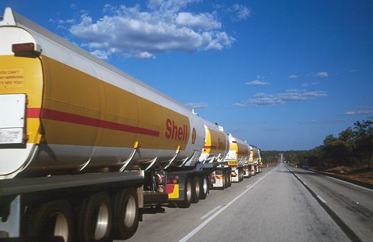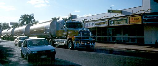 Meist fährt das Ding voll beladen in Richtung Alice Springs 80 bis 90 km/h, mit einem Campmobil kommt man also nur langsam näher. Dann ist es schließlich soweit, direkt vor der eigenen Nase rollen 125 Tonnen Benzin. Von hinten sieht es völlig harmlos aus, aber die Schatten auf der Böschung zeigen einem netterweise, wie viele Anhänger da vor einem fahren. Der hintere Teil des B-Double am Ende des Zuges schleudert hin und her, fast einem Meter nach rechts oder links. Wenn die Räder auf den Randstreifen kommen wird eine üble Staubwolke hochgewirbelt.