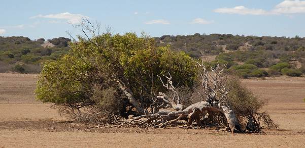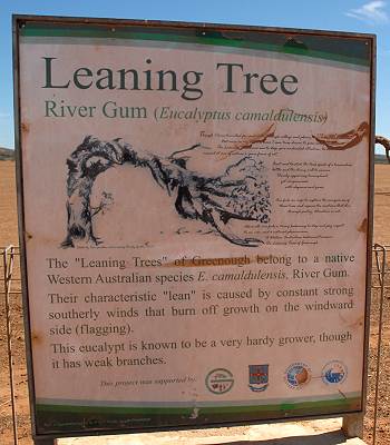 Nachdem wir kurz Geraldton und Greenough besucht hatten, folgten wir dem Highway weiter in Richtung Süden, quer durch die Greenough Flats. Das nächste Highlight liegt buchstäblich direkt am Wegrand und ist weithin sichtbar in der flachen Ebene mit Weiden und Rindern: die so genannten "Leaning Trees". Hierbei handelt es sich um Red River Gums (Eucalyptus camaidulensis), die sich auf Grund der hier ständig herrschenden südwestlichen Winde fast waagerecht über dem Boden befinden. Denn dieser Wind kommt vom Meer und bringt auch Salz mit, unter der Last der Kristalle haben die Bäume keine Chance und legen sich quer. Die wenigen Exemplare sind teilweise in einem recht beklagenswerten Zustand. Unten auf dem Bild ist das beeindruckenste Exemplar zu sehen, es befindet sich direkt neben dem Highway. Ein schönes Beispiel für die Kraft des Windes in dieser Region, dem Shire of Greenough, die zu den windigsten Orten in ganz Australien zählt.
