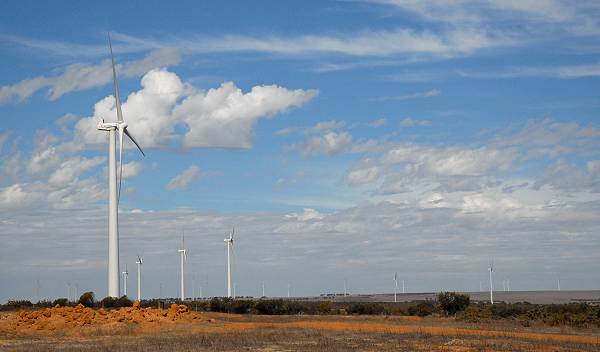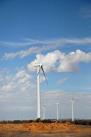 Natürlich macht man sich diese Kraft auch in dieser Region für die Energiegewinnung zu Nutze. Wir hatten auf den Karten von Geraldton ein Ausflugsziel entdeckt, ein Wasserloch mit Picknickplatz namens Ellendale Pool und fuhren dort hin, auf der Suche nach einem idyllischen Übernachtungsplatz. Der Weg führte über die Walkaway-Nangetty Road und vorbei an der Alinta Wind Farm, 35 km südöstlich von Geraldton Hier stehen Western Australias neuste Windräder, 54 Stück, die zu den weltweit Größten zählen und die das hier ständig wehende Lüftchen in Energie umwandeln. In den kühleren Monaten weht der Wind hier mit 20-25 km/h, von Oktober bis März erreicht er Geschwindigkeiten bis zu 35 km/h. Die Windräder sind 78 Meter hoch und die Rotoren haben einen Durchmesser von 41 Metern. Sie erzeugen elektrischen Strom mit 90 Megawatt Leistung für Perth und den Südwesten, genug für 60.000 Haushalte. Betrieben wird die Windfarm von Renewable Power Ventures (RPV) und rundum grasen Rinder auf den Weiden. Es gibt einige Informationstafeln oben auf dem Hügel an der Viewing Area, von der aus man einen weiten Blick ins Land und über die Windfarm hat.