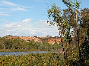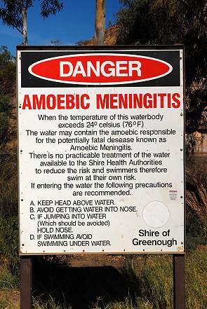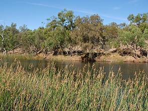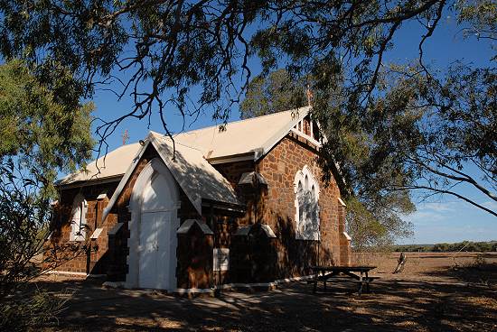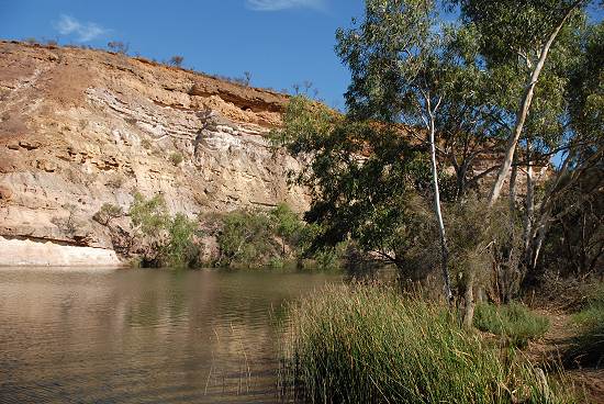 Die Anfahrt ist recht langweilig und erst kurz vor Ankunft sieht man Wasser, alte Red River Gums, grüne Wasserpflanzen am Ufer und einige Vögel. Vor dem Pool befinden sich einige Picknickplätze und 4 Gasgrills, ausserdem ein Spielplatz für Kinder und Toiletten. Campen ist hier auch erlaubt, das kostet 5 AU$ und ein Ranger kommt zum Kassieren vorbei. Allerdings lädt der Pool hier leider nicht zu einem Bad ein, große Warnschilder stehen am Ufer. Denn wenn das Wasser allzu warm wird, dann leben Amöben im Wasser, welche die gefährliche Meningitis, Hirnhautentzündung, übertragen. Obwohl einige Kinder bei dem mäßig warmen Wetter im Wasser schwammen, reizte uns hier nichts zum Baden. Da auch die Picknicktische und die schönsten Campingstellen schon weitgehend besetzt waren und es erst Mittag war, beschlossen wir nach einer ausgiebigen Rast weiter in Richtung Süden zu fahren. Die nächste Nacht wollten wir dann in einem kleinen Ort am Meer verbringen, ähnlich Horrocks, und fanden Leeman. Doch dazu mehr auf der Seite Turquoise Coast. Auf der Rückfahrt zum Highway kamen wir noch an der kleinen, historischen Kirche von Walakaway vorbei, die auf dem letzten Bild zu sehen ist.