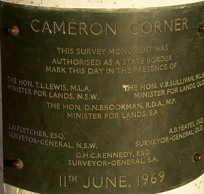 CAMERON CORNERCameron Corner ist jene Ecke im leeren Outback, wo die drei australsichen Bundesstaaten South Australia, Queensland und New South Wales aneinanderstoßen. Es wurde benannt nach John Brewer Cameron, einem Landvermesser des New South Wales Lands Department, der in der Region gearbeitet hat.