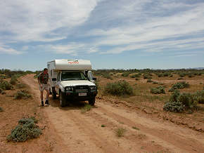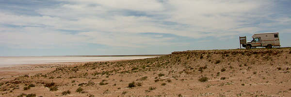 Unsere Gedanken schweiften unwillkürlich ab zu den Ochsenkarren der ersten Siedler, Vermesser und Goldsucher, die ohne Landkarten plötzlich am Ufer eines solchen Sees standen. Ohne die Möglichkeit einer Versorgung von außen und ohne Wissen darüber, wie weit sich diese Salzwüste nach Norden oder Süden erstrecken mochte. Keine besonders angenehme Vorstellung - heute ist eine Tagesetappe von damals mit dem klimatisierten Allrad in einer Stunde bewältigt.