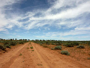 Kurz hinter dem Gate geht es ziemlich holprig durch einen Fluss, der allerdings wenig Wasser führte. An einem Vieh-Verteilgatter biegt der Weg dann nach rechts ab, ein Holzschild weist die Richtung. Der Track führt nun erst entlang eines Zauns an den Gebäuden der Station vorbei, die man rechts liegen läßt und dann stetig in Richtung Westen. Ausser Vieh sahen wir unterwegs nur einen Goanna, es war Mittagszeit und alle Tiere ruhten. Schatten gibt es hier nicht viel, die Landschaft wechselt von niedriger Buschsteppe zu Sanddünen, die man mit dem Allrad überqueren muss. Etwa 1,5 km hinter der Station zeigt ein weiteres Holzschild in Richtung Westen.