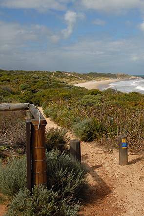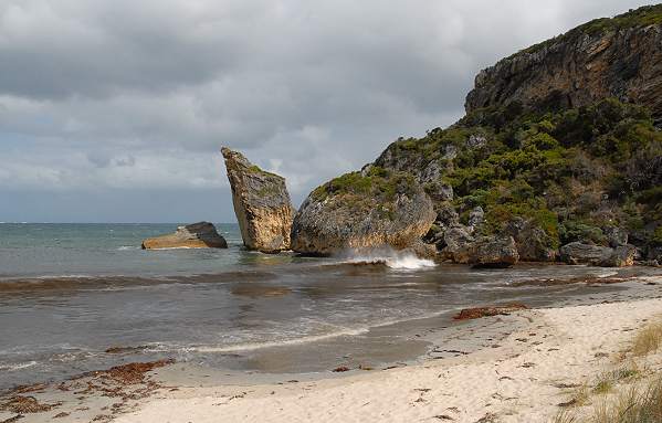 Ein weiterer Strand ist der von Windy Harbour. Der Ort ist ziemlich tot, eine reine Feriensiedlung, aber schon etwas älter. Der berühmte Bibbulman Track führt hier vorbei und es gibt feine Angelreviere entlang der Küste. Der kleine Strand vor dem Ort wird malerisch von einer sehr markanten Klippe, dem so genannten Cathedral Rock, begrenzt. Er sieht aber nur vom rechten teil der Bucht aus so bizarr aus, geht man weiter nach links am Strand entlang, dann verliert er seine einzigartige Form. Es hat den Anschein, als sei der Felshügel im Hintergrund bei seiner Entdeckung vor 200 Jahren viel größer gewesen und darunter entsprechend einer Kathedrale eine riesige Höhle. Irgendwann ist diese eingebrochen und es ist nur der eine einzeln stehende markante Felsen vor dem Rest des auf den Bildern erkennbaren Felsabbruchs übrig gebleiben.