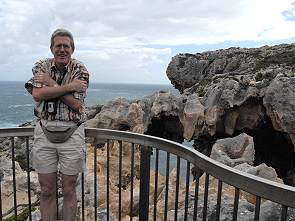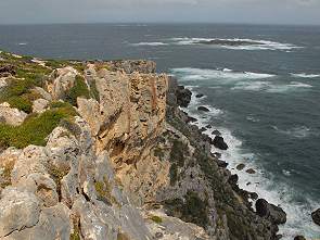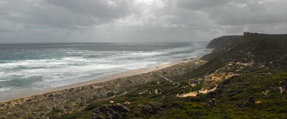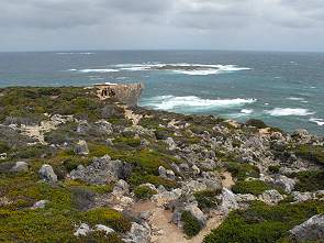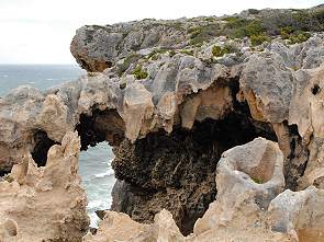 Vom schönsten Lookout aus sieht man durch ein Felsenfenster die Wellen, die sich am Kalkstein brechen und diesen langsam abtragen. Je nach Standort und mit ein wenig Fantasie hat der Ausschnitt die Form des afrikanischen Kontinents. An den Klippen kann man auch die Reste versteinerter Bäume erkennen. Zur richtigen Jahreszeit kann man von hier oben auch Wale beobachten. Wir hatten Pech mit dem Wetter, immerhin kam ab und zu die Sonne heraus. Dafür war der Wind recht heftig, Ausläufer eines weit oben im australischen naorden tobenden Tropensturms. Teilweise konnten wir am Geländer über der Klippe kaum stehen, so heftig pustete es.