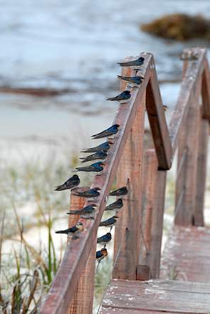Der Strand liegt geschützt in der kreisförmigen Bucht, so dass man hier schön schwimmen könnte. Hätten wir auch gerne gemacht, wäre es nicht so windig und kühl gewesen. Wir parkten auf dem kleinen Parkplatz oberhalb der Bucht. Ein hölzerner Boardwalk führt durch die Dünen zum Strand und zahlreiche Schwalben ruhten sich auf dem Handlauf aus. Ab und zu erhoben sie sich in die Luft, um über dem Strand Fliegen zu jagen, aber bei starkem Wind müssen sich die schnellen Flieger auch einmal ausruhen. So landeten sie kurze Zeit später wieder und saßen, wie auf einer Schnur aufgezogen, alle hintereinander.