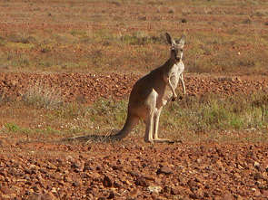 Rote Riesenkängurus sieht man häufig im Park, die sind weit verbreitet. Als wir von Cameron Corner am Abend kurz vor Sonnenuntergang nach Fort Grey fuhren hörten wir bei 50 Tieren auf zu zählen. Auf dem Bild unten sind gleich 7 Stück zu sehen. Natürlich kann man sie am besten am frühen Morgen und kurz vor Sonnenuntergang beobachten, dann hüpfen sie wirklich scharenweise über die Ebenen. Aber auch in der Mittagshitze waren sie in der trostlosen Öde der Gibber Plains unterwegs. Meist paarweise, Mutter mit Joey, so nennt man die Jungtiere in Australien.