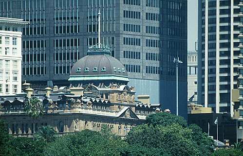 Auf dem Bild unten ist das 1876 von Walter Vernon entworfene Colonial Secretary's Office am Westrand des Botanical Garden zu sehen, direkt dahinter erhebt sich der Gouvernor Phillip Tower als Repräsentant zeitgenössischer Architektur.