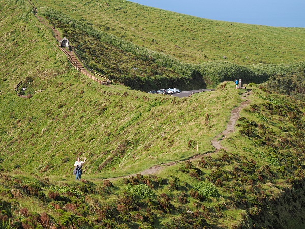 Oben an der Caldeira gibt es einen recht großen Parkplatz, da wir aber immer ziemlich spät am Nachmittag hier waren, gab es jede Menge freie Plätze. Für den schönen Kraterrundweg (PRC4FAI), der nur zu Fuß über eine Treppe zugänglich ist, war es dann leider immer zu spät. Die acht Kilometer lange und zweieinhalbstündige Wanderung ist auch nur bei gutem Wetter zu empfehlen. Starke Winde, rutschiger Untergrund und die zu beiden Seiten steil abfallenden Hänge machen den Weg bei Wolken und Regen zu einer echten Herausforderung. Hier läuft man immer auf dem Kraterrand entlang, mit 360°-Blicken von der Nordküste bis nach Horta und Pico. Wanderschuhe, Regenjacke und Trittsicherheit sind Voraussezung für diesen Wanderweg.