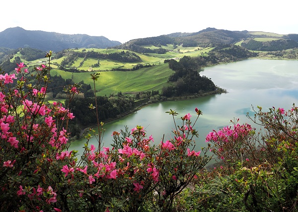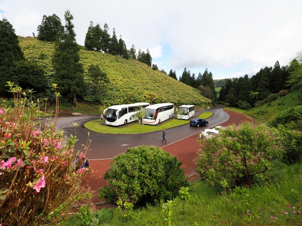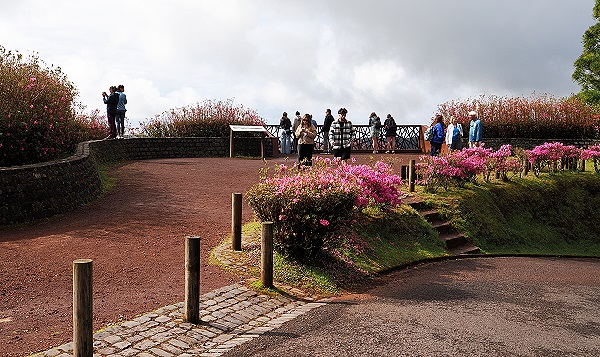 Vom Zentrum von Furnas aus sind es etwa 6 Kilometer bergauf bis hierhin auf der EN2-1A und am Ende die Abzweigung links zum Aussichtspunkt. Natürlich ist man hier nie alleine, etwas unterhalb auf dem Parkplatz am Ende einer Stichstraße halten alle: Mietwagen, Tourveranstalter und große Reisebusse. Dann läuft man knapp hundert Meter auf Asphalt etwas bergauf zum Aussichtspunkt, Ende Mai vorbei an vielen noch pink blühenden Azaleenbüschen.