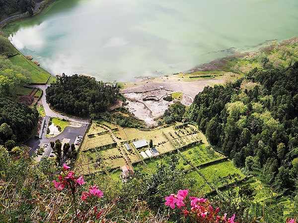 Man kann von hier oben auch sehr deutlich die Caldeira erkennen, eine große Senke mit den Maßen 8 x 5,6 Kilometer in der sich Furnas befindet und die in den letzten 800.000 Jahren durch zahlreiche Ausbrüche, unterbrochen von Phasen der Ruhe, entstanden ist. Der höchste Punkt des Bergkranzes liegt 570 Meter über dem Meeresspiegel.