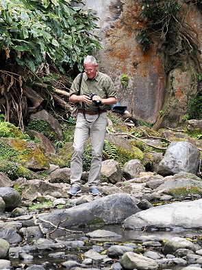 Von hier aus sind es bis zu der Kaskade nur noch 550 Meter, es geht aber steil bergab. Michael hat gemessen, unten auf dem vorletzten Bild zu sehen: Hier gab es ca. 20% Gefälle, und das war noch nicht die steilste Stelle. Unterwegs sieht man Hühner, Rotkehlchen und am Wasserfall kommen unscheue Azoren-Finken recht nah heran.