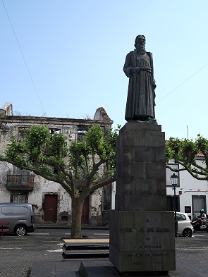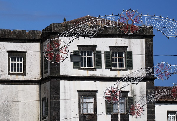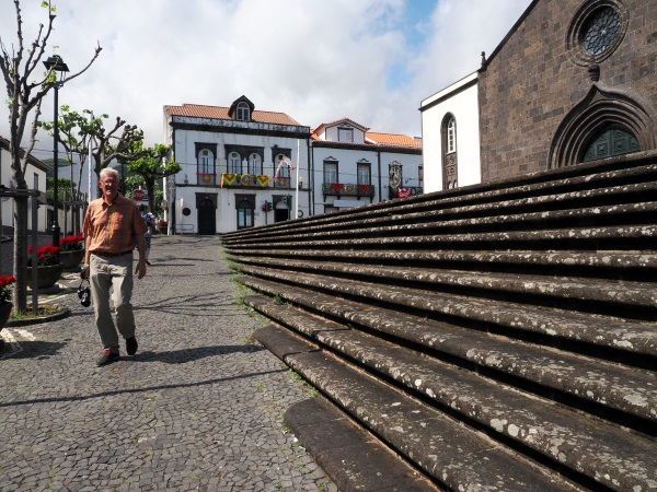 Wir spazierten durch das Stadtzentrum und wollten die Pfarrkirche São Miguel Arcanjo besuchen. Diese dem Erzengel Michael geweihte Kirche, mit ihrer mit dunklem Basalt verkleideten Fassade, wurde im 15. Jahrhundert errichtet und aus dieser Zeit stammt noch das gotische Hauptportal. Sie wurde durch das Erdbeben von 1522 teilweise verschüttet und bald darauf wiederaufgebaut. Dabei wurden Baumaterialien der ursprünglichen Kirche wiederverwendet, das Gotteshaus zählt damit heute zu den ältesten Gebäuden auf São Miguel. Leider war sie geschlossen und wir konnten sie nur von außen fotografieren.