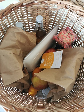 Im Korb enthalten waren Toastbrot, diverse Brötchen oder Croissants, Schraubgläser mit Buter, Marmelade, Nutella, Frischkäse, Joghurt und Süssigkeiten. Es gab zwei ungekochte Eier täglich, die wir gesammelt und dann selbst zubereitet haben. Milch und Orgensaft im Wechsel mit Apfelsaft gab es in Flaschen, einige Scheiben Schnittkäse und Wurst oder Schinken kamen in einem flachen Behälter. Nach all dem leckeren Insel-Käse, den wir in den Wochen vorher gekauft und gegessen hatten, war das kein Highlicht für uns, aber alles brauchbar. Dazu Obst wie Mandarinen, Bananen oder Äpfel.