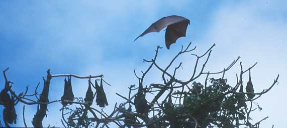 Auch Vertreter der flatternden Art, große und kleine Batmans, hängen tagsüber kopfunter an den Ästen. Sie beginnen in der Dämmerung um die Lampen zu torkeln wie betrunkene Schwalben.
