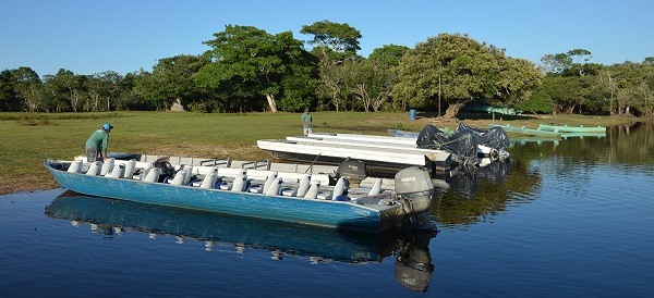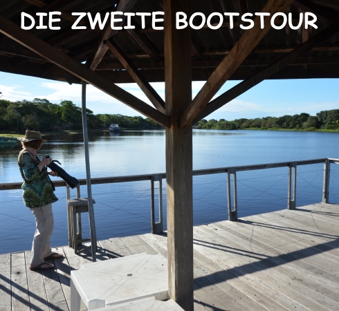 Am frühen Morgen des zweiten Tages trafen wir uns wieder mit unserem Guide von der ersten Bootstour am Tag zuvor am Anlegesteg der Pousada Rio Mutum. Hier liegen rechts und links die Boote und Kanus der Lodge, es gibt sogar ein Hausboot, das in der Nähe vor Anker liegt. Die Plattform dient dem bequemen Ein- und Austieg vom Boot, unter dem Schattendach hängen die Schwimmwesten im Flecktarn-Look. Nachdem wir diese angelegt hatten, kam auch schon das Boot und wir konnten einsteigen. Bleibt noch zu erwähnen, dass wir wieder ein ganzes Boot mit Bootsführer für uns alleine hatten.