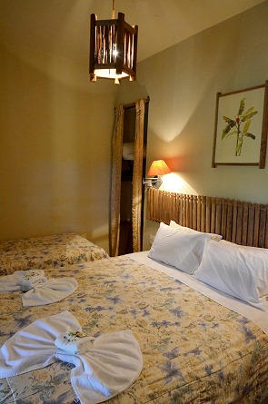 In der Pousada do Parque stehen den Gästen jeweils 2 Dreibett- und 6 Doppelzimmer zur Verfügung deren Eingänge sich rund um das Haus verteilen. Die Zimmer sind leider sehr klein, doch zweckmässig und ausreichend eingerichtet. Wir hatten Glück und bekamen ein Dreibett-Zimmer an der Ecke, das war minimal geräumiger. Das Bett war bequem und wir haben mit viel Ruhe hervorragend geschlafen. Wenn voll ausgebucht ist, könnt es etwas lauter werden.