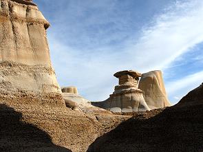 Hoodoos sind Gesteinssäulen aus Kalkstein, die sich durch Wind geformt haben. Ein größerer Stein liegt wie eine Kappe oben drauf und schützt das weiche Gestein darunter vor Erosion, so bildet sich im Lauf der Zeit eine Säule. Sie entstanden innerhalb der letzten 40 bis 60 Millionen Jahre. Hier in Kanada sind sie nur 5-7 Meter hoch, aber trotzdem ganz nett anzuschauen. Da sie schief sind ist es schwierig sie zu fotografieren. Abgesehen von dieser berühmten Stelle findet man am Highway 10 noch viele weitere Hoodoos, daher ist diese Strecke auch als Hoodoo Trail ausgewiesen.