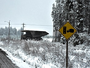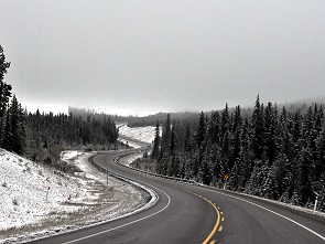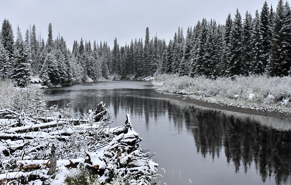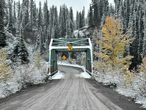 Nachdem wir im eingescheiten Ort Hinton auf dem Beaver Boardwalk einen Morgenspaziergang gemacht hatten bogen wir auf den Highway 40 in Richtung Süden ab. Die ersten Kilometer waren problemlos zu befahren, denn hier war noch asphaltiert. Dann änderte sich der Belag und wir folgten der Dirt Road. Mit unserem Allrad Truck gar kein Problem, bei schönem Wetter aber sicherlich mehr Vergnügen. Aber die Straße war aufgeweicht durch den vielen Regen und Schneematsch mit Gravel klatsche überall an unser Fahrzeug. Die verschneite Landschaft mit tief hängenden Wolken wirkte auf Dauer nicht sonderlich einladend.