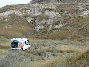 Schon der Blick durch das hintere Fenster unseres Campers auf die Landschaft des Dinosaur Provincial Park bei Sonnenaufgang war atemberaubend, so standen wir recht früh auf, gönnten uns ein eiliges Frühstück und nahmen den Rundweg in Angriff. So früh waren wir die einzigen, die meisten unserer kanadischen Nachbarn lagen noch in den warmen Betten.