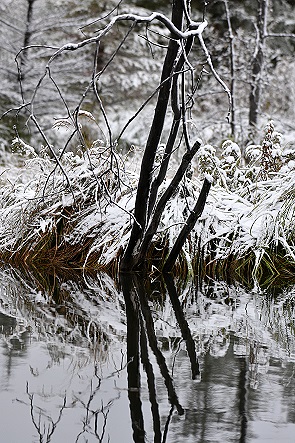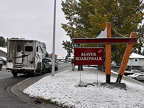 Am Morgen dann sie Überraschung: wir waren über Nacht eingeschneit. Am 20. September im Mittelgebirge, unten ist auf zwei Fotos der See am Abend und am nächsten Morgen zu sehen. Bei Null Grad befreite Michael mit Hilfe eines Besens erst einmal unseren Truck Camper vom Schnee. Dann fuhren wir wieder zurück in Richtung Hinton.