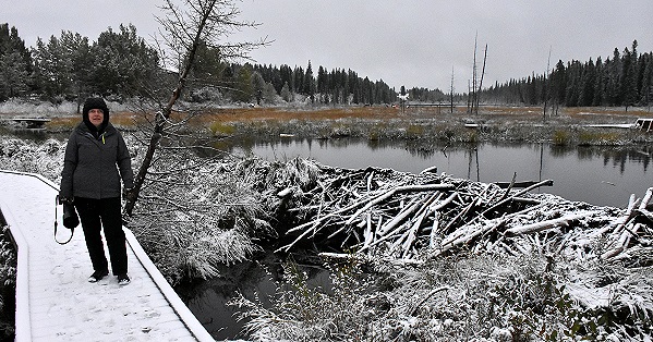 Gesehen haben wir dabei ein paar Enten und einen Eisvogel, im Wald einige kleinere Vögel und Hörnchen. Die Aussichtsplattform war geschlossen. Der Happy Creek fließt hier durch den Bibersee und weiter zum Maxwell Lake, aber der Zugang dorthin war wegen Maintenance an einer Brücke ebenfalls gesperrt. So liefen wir einmal um den Bibersee herum und dann den Upstream Loop durch den verschneiten Wald. Immerhin konnte man sehen, wie fleißig die Biber waren: Das Wasser im Teich war etwa einen Meter höher als der Abfluss unter dem Steeg.