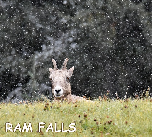 Doch jetzt war erst einmal der Campground an den Ram Falls unser Ziel, 1,5 Stunden waren noch zu fahren. Die Trunk Road führt vorbei an herbstlich gefärbten Strauchflächen, hier kann man bei schönerem Wetter sicher viele Tiere sehen. Es schneite die ganze Zeit leicht, an der Abzweigung zum Campground trafen wir auf eine kleine Gruppe Dickhornschafe.