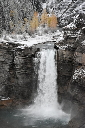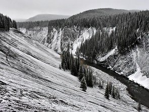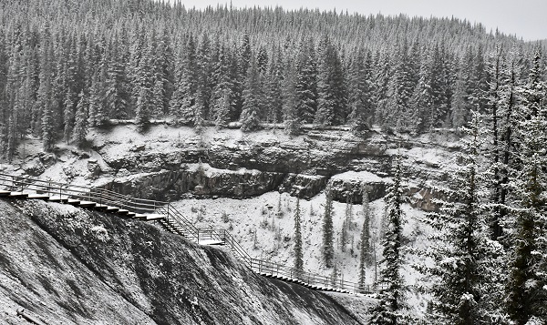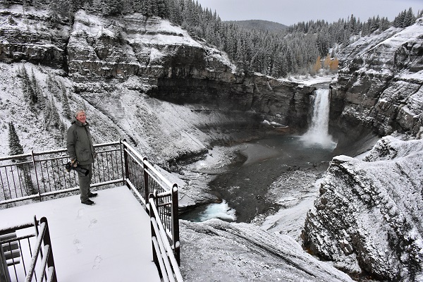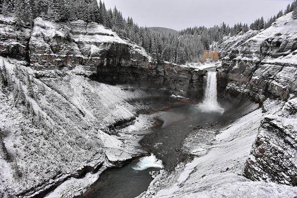 Wir sind hier natürlich wieder ganz alleine unterwegs, das ist einfach herrlich. Beim Ab- und Aufstieg über die vielen eingeschneiten Stufen bis zur Plattform müssen wir aber extra vorsichtig sein: Wer sich hier die Haxen bricht ist ebenfalls allein, schnelle Hilfe ist nicht zu erwarten. Die Falls sehen jetzt mit etwas Schnee besonders beeindruckend aus und sind sehr fotogen. Der Canyon besteht aus erodiertem Schiefer und Sandstein, hier kreisen oft Steinadler, Weißkopfseeadler und amerikanische Turmfalken. Leider sehr weit weg und bei trübem Licht nicht zu fotografieren. An den Hängen der 2.850 Meter hohen Ram Range sind während des ganzen Jahres Dickhornschafe zu sehen, mit etwas Glück auch mal Schneeziegen.