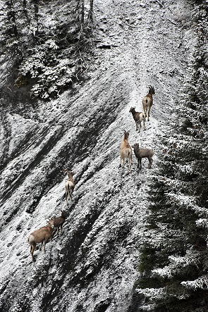 Danach warm anziehen und dann laufen wir endlich in Richtung Wasserfall. Die kleine Wanderung zu den Ram Falls ist wunderbar, wir hinterlassen die ersten Spuren im frisch gefallenen Schnee. Am Picknickplatz stehen einige Dickhornschafe, die sich bei unserer Ankunft misstrauisch langsam in Richtung Steilwand verabschieden. Und ganz plötzlich springen sie über die Absperrung in den Abgrund! Faszinierend zu beobachten, wie die Weibchen und Jungtiere sich im steilen Gelände bewegen. Auf der anderen Seite kann man einen Trampelpfad in der steilen Schotterhalde erkennen.