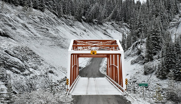 Bei Nordegg erreichten wir den David Thompson Highway, es war es noch früh genug um weitere 64 Kilometer zu fahren. Dort gab es den Ram Falls Provincial Park, von dem ich schöne Fotos gesehen hatte. Daher wollten wir unbedingt dort hin. Die Forestry Trunk Road änderte sich jetzt. Waren wir vorher viele Kiometer auf matischer breiter Piste mit vielen Schlaglöchern unterwegs, wurde die Strecke hier enger und kurviger. Aber auch viel besser gepflegt, selbst bei Schnee fuhr es sich hier gut. In diesem Abschnitt gibt es keine Minen und keinen schweren Versorgungsverkehr. Eine Brücke führt über den North Saskatchewan River.