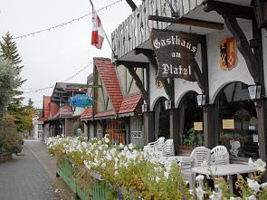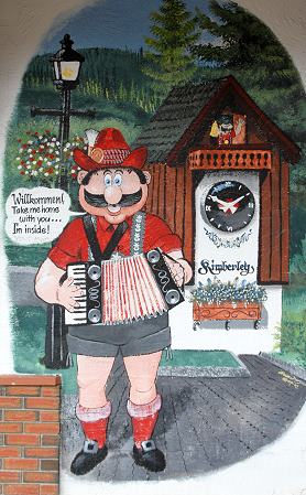 Zu Beginn der siebziger Jahre war Kimberley ein kanadisches Bergdorf wie so viele andere auch. Dann wurden die Bleimine und die Zinkmine geschlossen und die Bewohner mussten sich überlegten, wie man Touristen anlockt um Geld zu verdienen. Berge und Schnee gab es überall anders auch, aber Kimberley wollte anders sein als die umliegende Konkurrenz. Da der Anteil an Deutschstämmigen Bewohnern groß war, baute man das Dorf um nach dem Vorbild eines Skidorfs in den Alpen. Hier stehen die Häuser auch ausserhalb des Ortskerns tatsächlich etwas enger zusammen als in anderen Orten, die Straßen sind etwas enger und kurviger, und das Zentrum mit seiner Fußgängerzone(!) wurde "Platzl" getauft. Damit hatte man schnell Erfolg, denn nicht nur den kanadischen und amerikanischen Touristen gefällt es hier, auch die Deutschen kommen offenbar gerne um mal wieder Bratwurst mit Sauerkraut zum Preis von 10,95 Dollar zu essen.