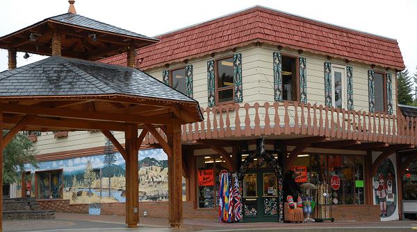 Wir besuchten das Platzl wie gesagt an einem regnerischen Sonntag im Herbst, die Geschäfte hatten geöffnet, aber es waren nur wenige Besucher unterwegs. In der Fußgängerzone wird man vor verschiedenen Läden mit alpenländischer Volksmusik beschallt, es gibt ein paar Restaurants mit dem entsprechenden Angebot und ganz besonders fiel uns der Laden eines älteren Paares in prominenter Ecklage auf. Es stand zum Verkauf und war rundum mit bunten, kanadischen Wildtieren bemalt. Im Inneren gab es ein wildes Durcheinander an Kitsch und Krempel. Hier findet man Wollsachen "Made in China" neben dem CD Regal mit den Flippers und den Kastelruther Spatzen, dazu russische Babuschka-Puppen, chinesische Kimonos mit Drachen und Kuckucksuhren. Wobei man es in Kimberley insgesamt nicht so genau nimmt in der Unterscheidung zwischen Schwarzwald, Alpenland und China.