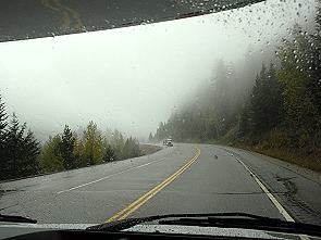 Auf dem Parkplatz standen ein paar silberne Airstream-Anhänger aus Kanada und den U.S.A. in verschiedenen Größen, irgendwo musste ein Treffen stattfinden. Auch unterwegs sind wir noch über einem Dutzend davon begegnet. Da unser Camper ein wenig schräg noch vorne bergab stand, hatte sich hinter dem Alkoven-Knubbel Wasser auf dem Dach gesammelt, was zu unserem Erstaunen irgendwie ins Innere gedrungen war. Die Naht in der Decke war feucht und das Pappelholz in einem der Hängeschränke neben der Tür diente als Schwamm. Nix wie weg aus dem Regenloch in Richtung Tete Jaune Cache.