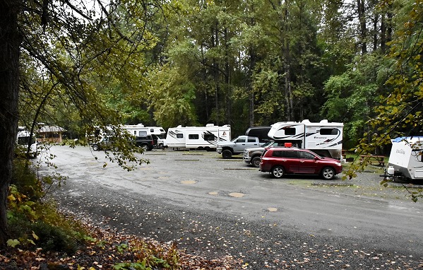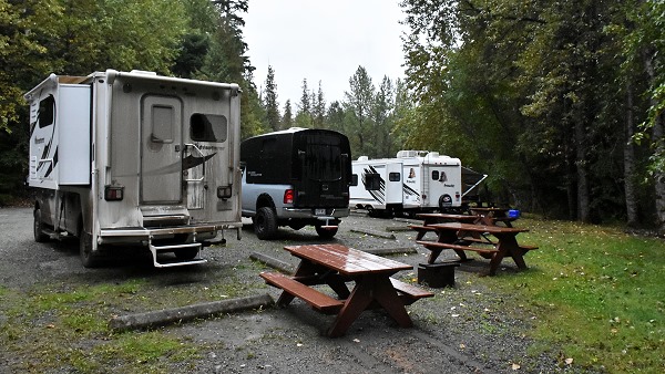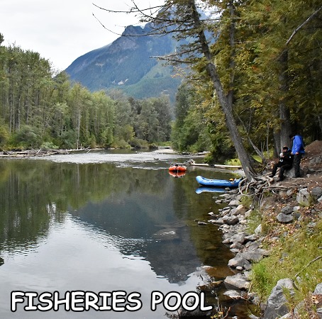 Wesentlich günstiger und in ähnlicher Lage wohnt man auf dem benachbarten Campingplatz, dem einzigen geöffneten Campingplatz der Region im September: dem Fisheries Pool Campground. Hier hatten wir Glück und fanden noch einen freien Platz für die erste Nacht. Der Ort ist sehr beliebt bei Anglern, die hier Lachse wie Pink Salmon, Chinook und Coho angeln, es gibt aus Forellen, Weißfisch und Saibling im Bella Coola und Atnarko River.