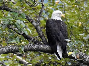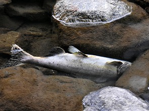 Wir haben hier einen Seeadler und einen Eisvogel gesehen, aber leider keinen Bären. Am Ufer lagen ein paar tote Lachse, lebendige schwammen aber ebenfalls noch flussaufwärts und waren im klaren Wasser gut zu erkennen. Ab und zu sprang einer hoch und landete klatschend auf der ruhigen Wasser-Oberfläche. Kalt und ungemütlich war es und als es nach einigen Stunden Ausharren auch noch regnete gaben wir auf.