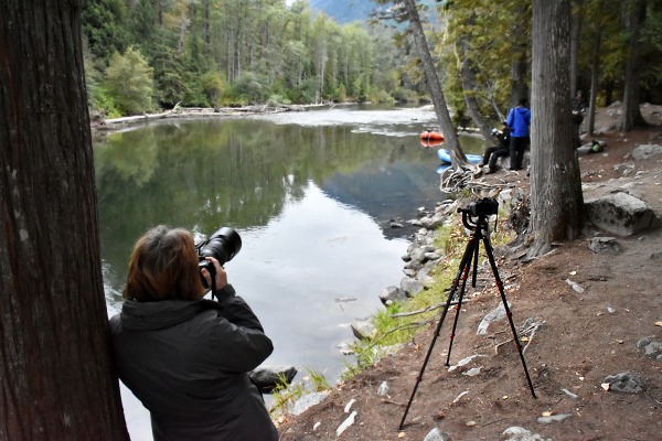 Der Vorteil wenn man hier wohnt ist die Nähe zum Flussufer, an dem sich auch hier öfter Bären zeigen. Ein Ranger passt im Hintergrund darauf auf, dass sich die versammelte Fotografenmeute entsprechend ordentlich benimmt. Viele kommen mit Stativ und Campinstuhl hierher und sitzen den ganzen Tag am Flussufer, auf den Bären wartend.