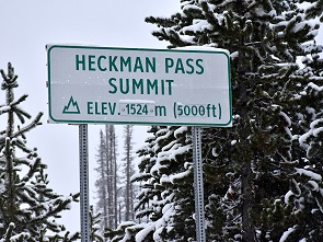 Der Heckman Pass markiert das westliche Ende des Chilcotin Plateaus, ab hier geht es nur noch steil bergab auf Meereshöhe. Oben auf dem Plateau und unten im Bella Coola Valley stehen Warnschilder: Lawinen, Steinschlag, Schlamm, Eis und heftige Wetterumschwünge sind hier normal. Bei unserer Hinfahrt war die Landschaft sanft mit etwas Schnee gepudert, bei der Rückfahrt hatten wir dann heftigen Wintereinbruch.