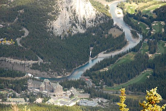 Wir wollten das Hotel von hinten fotografieren und wurden sofort von Wachpersonal angesprochen, weil wir für ein Foto ca. 5 Meter auf einen Weg am Golfplatz getreten sind. Ganz in der Nähe des Hotels befindet sich der größte Wasserfall des 623 Kilometer langen Bow River. Dieser entspringt dem Bow Lake, der vom Bow-Gletscher und vom Crowfoot Gletscher gespeist wird. Nahe bei Grassy Lake fließt er dann später mit dem Oldman River zusammen und bildet den South Saskatchewan River.