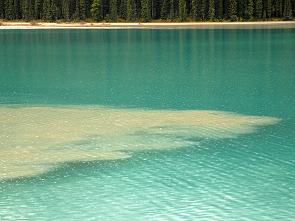 Beim zweiten Besuch hatte es vorher tagelang stark geregnet und wir konnten braune Schlammassen erkennen, die in den See hineinflossen. Sie bildeten einen starken Kontrast zu dem intensiven Türkis, unten auf dem kleinen Foto ist es ganz gut zu erkennen.