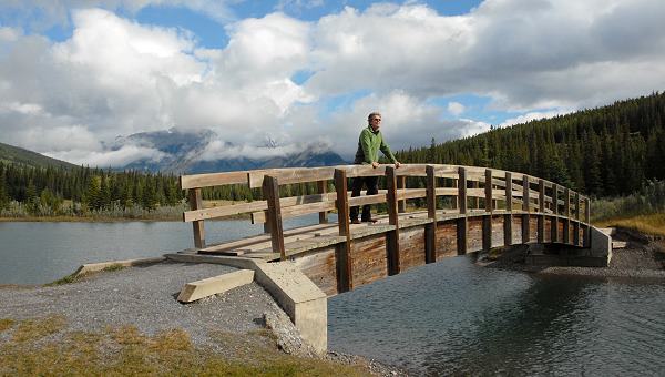 An der Highway-Abfahrt namens Lake Minnewanka Interchange, kurz hinter einer Wand mit bizarren Hoodoo-Auswaschungen, bogen wir dann zum See hin ab. Eigentlich nur, weil gerade in diesem Augenblick die Straße in Richtung Banff wegen eines Radrennens gesperrt war. Zuerst wurden wir auf einen riesigen Picknickplatz direkt neben dem Highway geleitet, der an einem kleinen künstlich gestalteten See liegt, den wir von oben schon gesehen hatten. Bis auf ein paar Spaziergänger mit ihren Hunden war hier um diese Jahreszeit nicht viel los und wir beschlossen, uns ein wenig die Beine zu vertreten.